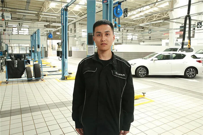 刘九宏同学站在工位旁,有种很踏实沉静的感觉。即使是当一辆需要保养的车开进来,要迎上前去和客户交流时,他的步伐中,也透着丝丝沉稳。