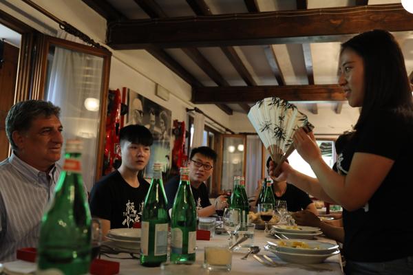 在法拉利餐厅,极速少年团送给随行工程师克劳迪奥极具中国特色的礼物——宣纸折扇,并演示如何使用。扇面图案为竹林,体现中国文人谦虚的品质,也彰显汽车人们的不断钻研和上进的精神。